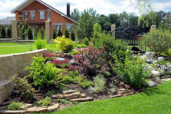 The entrance area to the site is located from the central gate to the house, along all the paths. Decorating it with an alpine slide is boring, because gardeners resort to successful combinations and complement the composition with other plants. It makes no sense to build a huge alpine slide in the entrance area. It will not only be ugly, but also irrational in terms of space allocation.