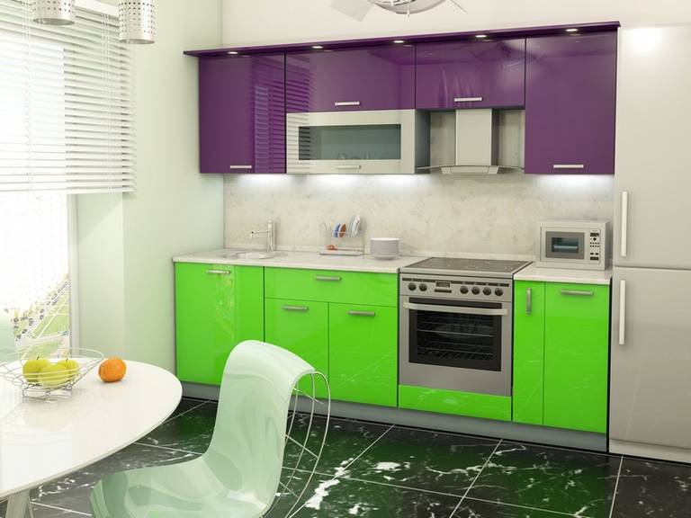 Purple and green should not be equally saturated, because low brightness of one of them will cause visual expansion of space, which is not always appropriate. The combination is especially suitable for kitchens in the style of Provence.