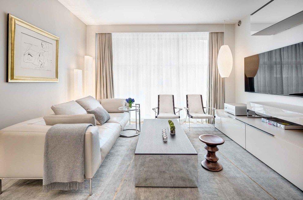 The sophisticated style of Soho is beautiful. Such a room can include a white corner sofa, panoramic windows, a brown coffee table.