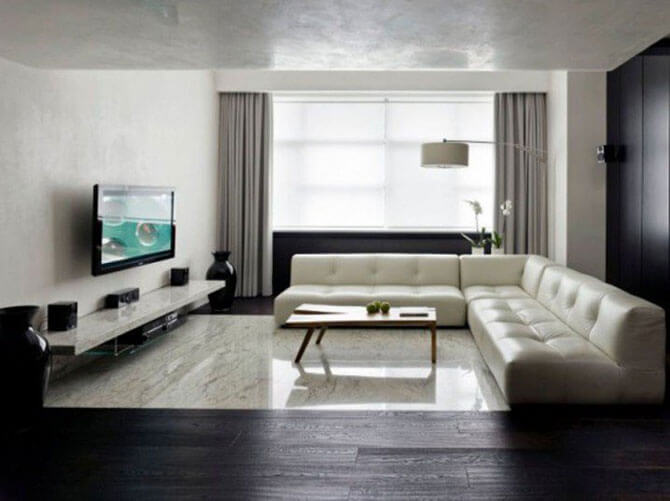 Minimalism is the perfect solution for a small living room. It helps to increase the space and make it light. This style involves effective zoning of space, the use of complex structures and niches. This allows the entire area to be used. An excellent solution for a small room would be the use of folding tables, sliding doors, compact furniture. The decoration should be as simple as possible. It is executed in light colors.