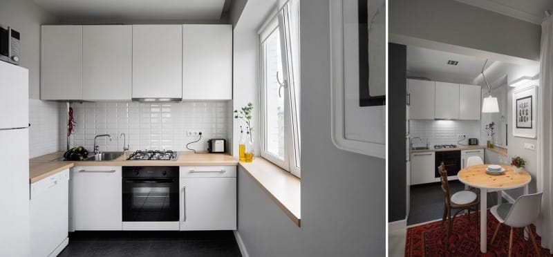 If you remove the door and the window opening, the kitchen area will "grow" from 2 to 7 meters. Here you can place a refrigerator, take out the dining area.