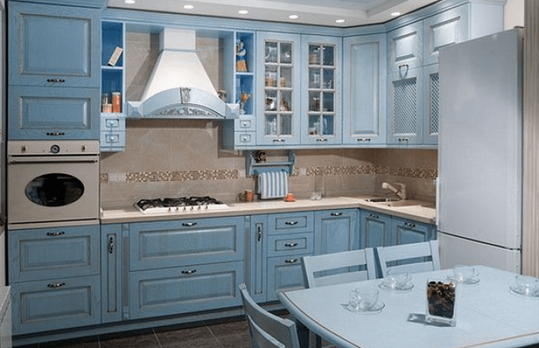 In the kitchen, light colors are more often used in the design, which indicates the sterility of the room. Indeed, on a light background, pollution that requires immediate cleaning is more noticeable. It is better to choose a blue kitchen so that household members can eat in a good mood.