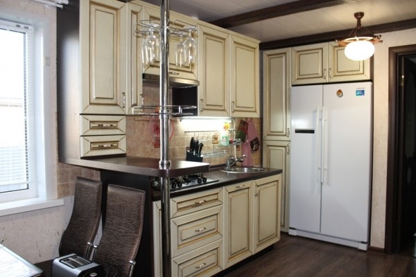 - Country style. A combination of shades of light brown and brick. The basis is the milk-cream facade of the cabinets; the patina is done with the use of gold paint along the perimeter of each cabinet door. The apron is decorated in a masonry style with rough seams. The worktops are in beige natural stone. The effect of antiquity is emphasized by heavy forged handles, processed by a grinding machine.