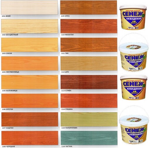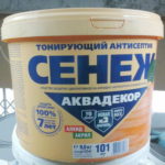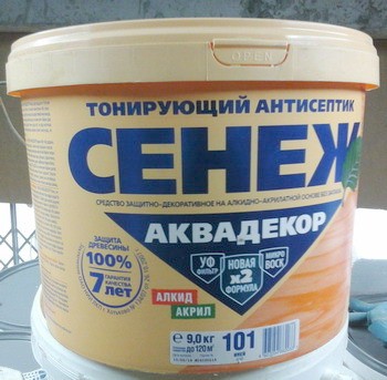 Wood of different ages and types of processing is painted with glaze paints with pronounced antiseptic qualities. SENEZH AQUADECOR is an antiseptic from a Russian manufacturer. It is applicable for indoor and outdoor use.