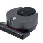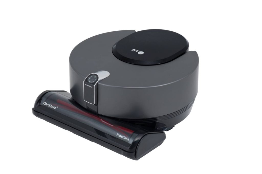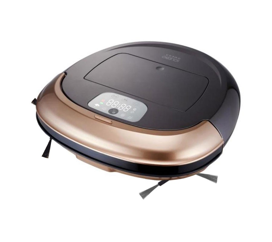 A modern carpet cleaning robot with a hairbrush cleaning system to prevent the device from tangling.