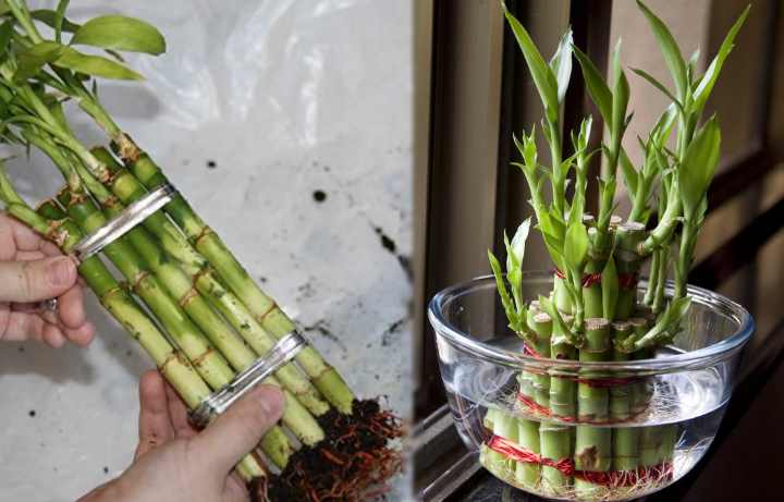 Sander bamboo looks beautiful and elegant in a transparent vase in water. The bottom of the container is covered with a small amount of pebbles washed in boiling water. Bamboo roots are cleaned of soil residues, placed in a container, poured with settled water.The use of tap water is unacceptable. Only healthy bamboo is grown in water. If the plant is affected by root rot, the infection will multiply at double intensity during aquatic cultivation.