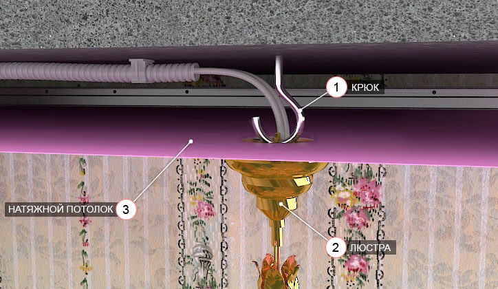 If the chandelier is mounted far from the place where the wiring passes, then it is necessary to stretch the cables under the stretch ceiling to the point of installation of the lamp.
